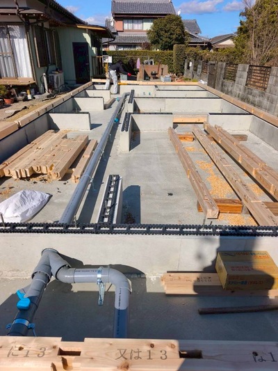 M様邸の新築工事が着工しました。基礎工事完了後、土台敷きを施工。 住まいの品質を左右する重要な工...